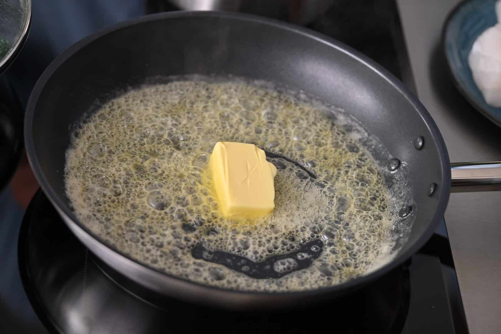 160 – 175 °C is a good range for making ghee. Ghee is browned butter that is great for frying. Cook the butter for 5-6 minutes. When all the water has evaporated and the butter has browned then, strain off the fat. This gives you a type of clarified butter with a golden nutty flavour and aroma that you know from frying in butter. One of the benefits of ghee is that it doesn’t burn as easily as regular butter and can therefore be used at higher temperatures.