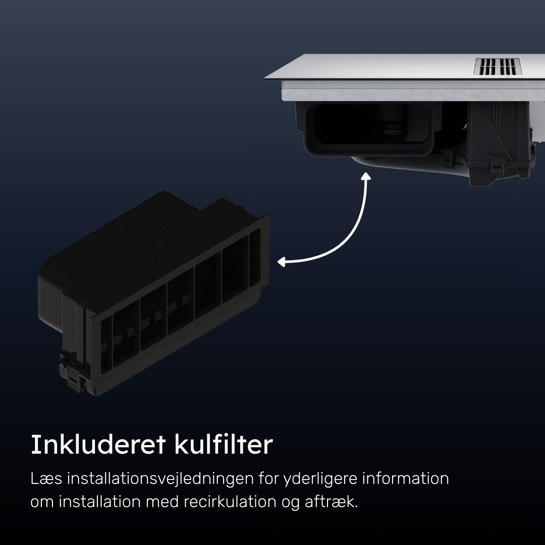 Kogepladen kan installeres både med aftræk og recirkulation. Læs mere om begge løsninger i installationsmanualen.