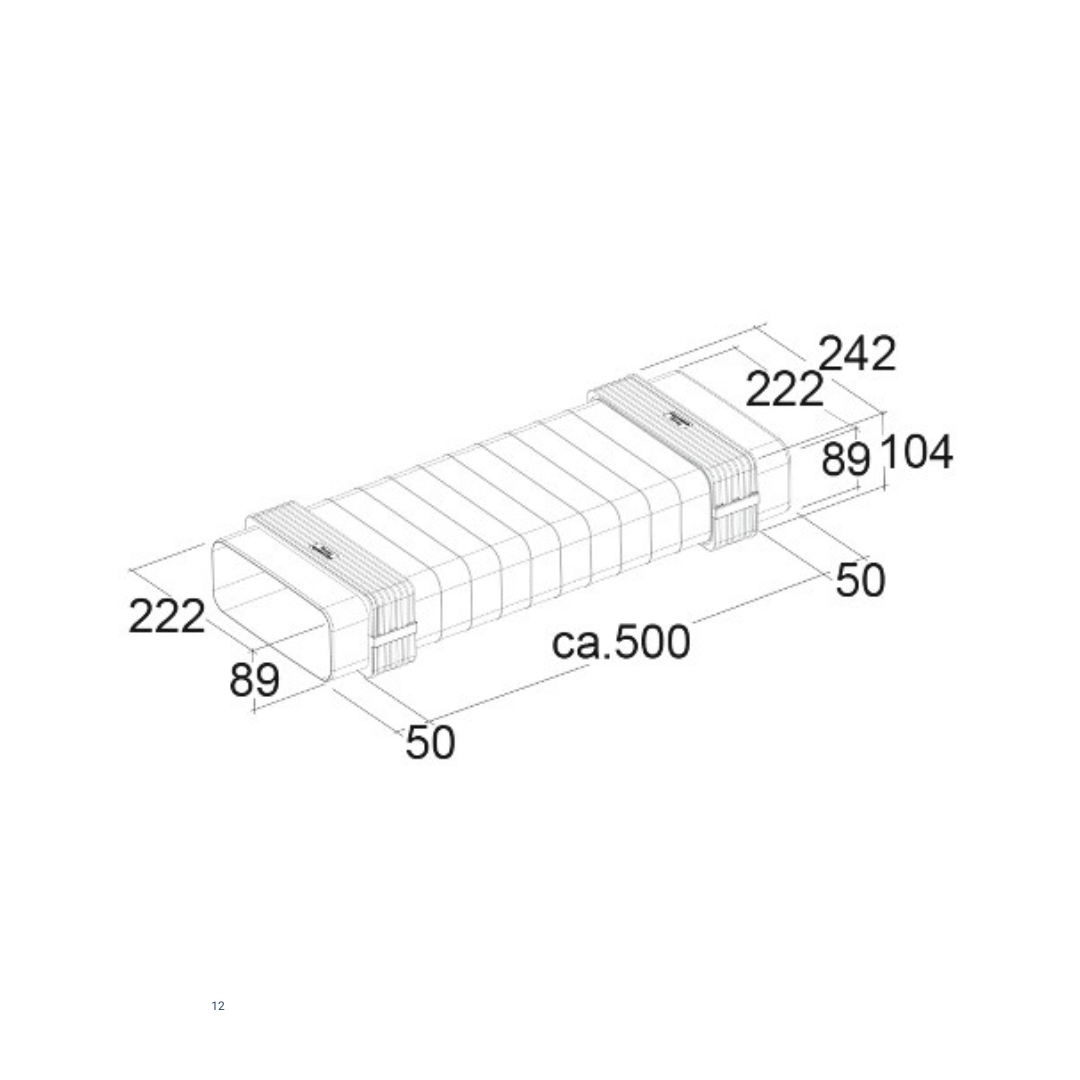 Flad 89 x 222 mm aftrækskanal med en fleksibel længde fra 240 mm til 500 mm. Til installation af emhætte.