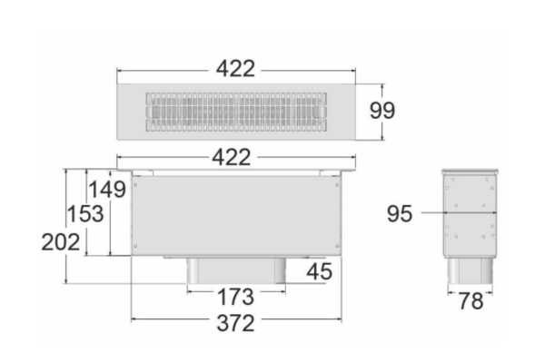 The module filters cooking air through a regenerable carbon filter and releases the cleaned air through the base of your cabinets. It’s a practical solution for island kitchens or installations where wall ducting isn’t possible.